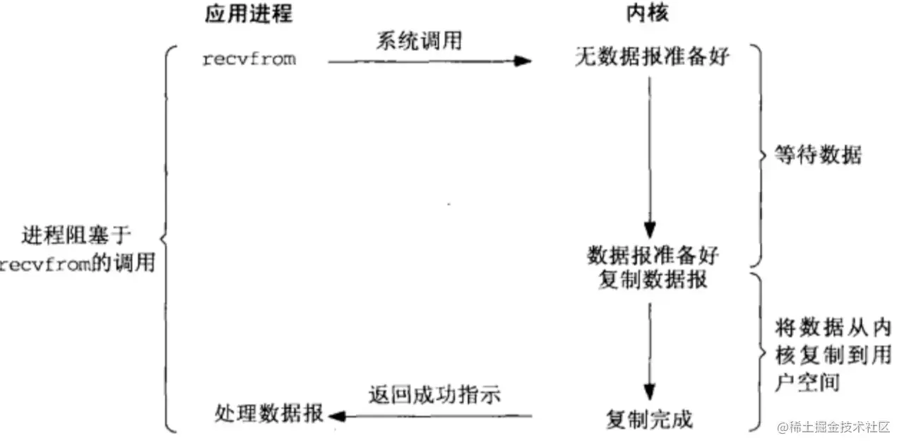 函数调用期间,一直被阻塞,直到数据准备好且从内核复制到用户程序才返回,这种IO模型为阻塞式IO 阻塞式IO式最流行的IO模型