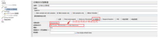 1.给登录的HTTP请求添加一个正则表达式,从头部提取JSESSIONID,如下所示: