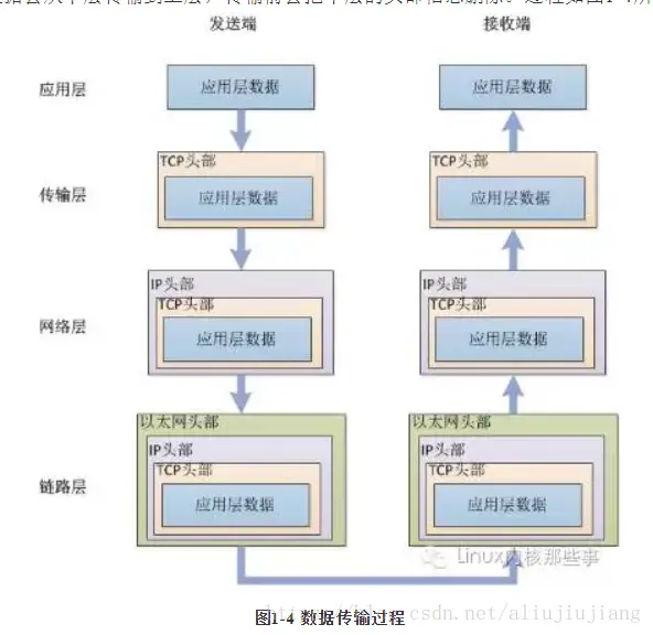 发送端发送数据时,数据会从上层传输到下层,且每经过一层都会被打上该层的头部信息。而接收端接收数据时,数据会从下层传输到上层,传输前会把下层的头部信息删除。