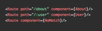 现在,如果URL是/about,<Switch>将会开始寻找相匹配的<Route>。<Route path="/about" />将会被匹配到,紧接着 <Switch>会停止继续匹配并且渲染<About>。同理,如果URL是/michael,那么<User>将会被渲染。