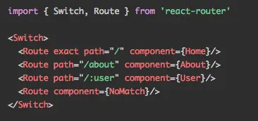 然而,有时,我们只想选择性的渲染一个<Route>。如果URL是/about我们并不想也匹配到/:user(或者显示给我们404页面)。参阅图1-2,看看如何使用<Switch>来处理这个问题的: