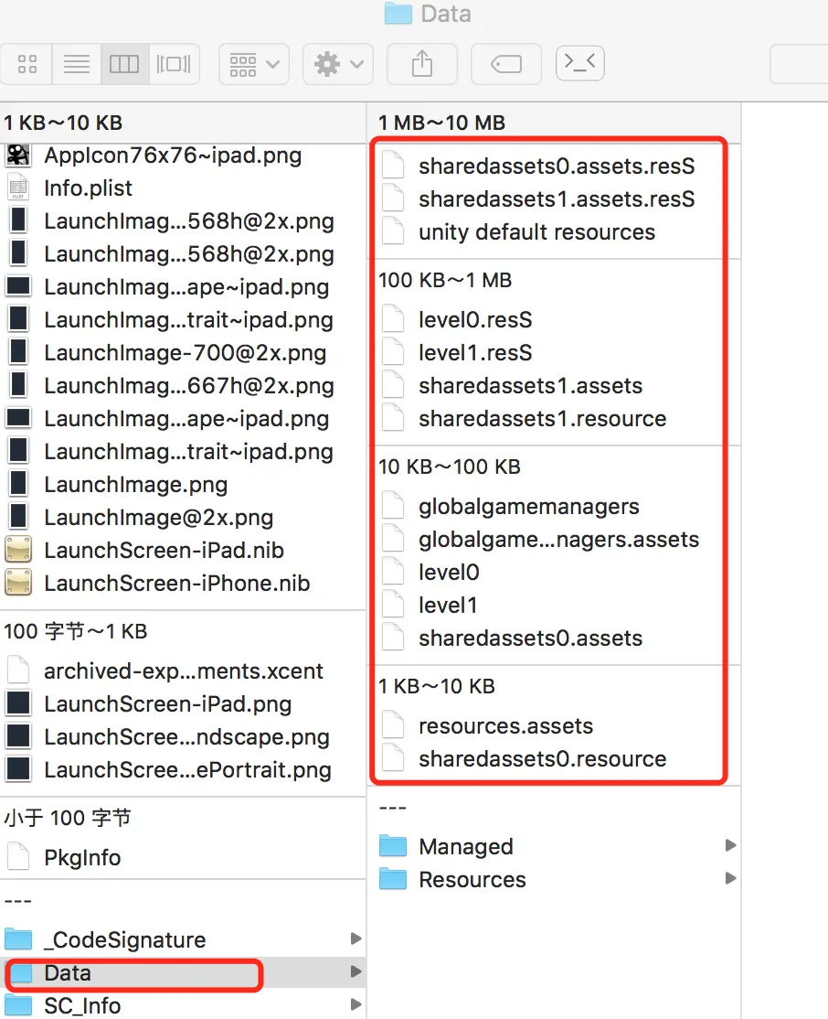 可以看到这个包里有个Data文件夹,其中有 assets 和 resource 为后缀的文件,不同的app,这些文件数量也是不同的。类似上图中,你看到这些文件后,就可以确定这是一个用Unity3D开发的游戏。一个游戏中可能有多个sharedassetsX.assets文件,例如sharedassets0.assets、sharedassets1.assets、sharedassets2.assets等等。
