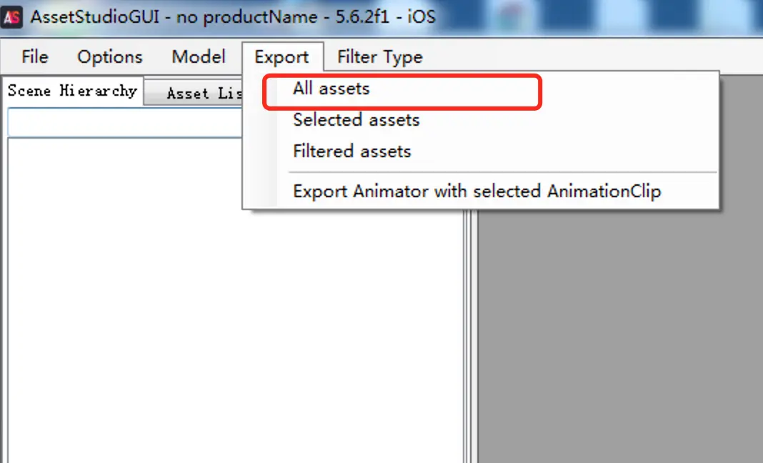 菜单选择"Export"->"All assets",导出资源文件: