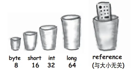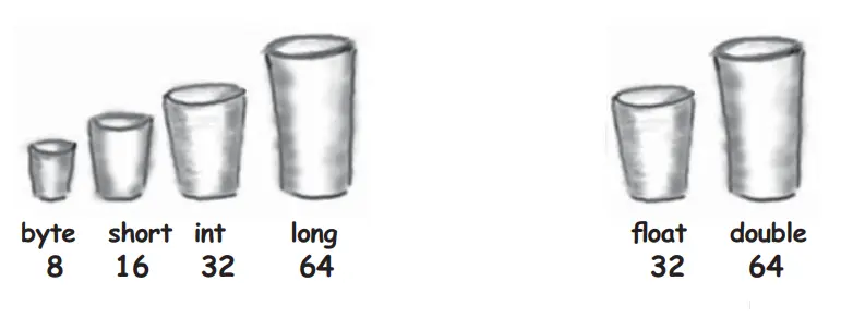 每种primitive主数据类型变量有固定的位数(杯子的大小),存放数值的primitive主数据类型有下列6种大小