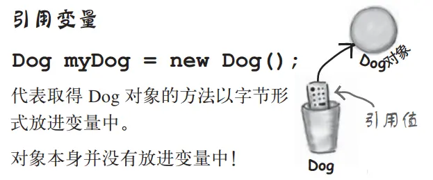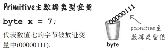 注: 对primitive主数据类型的变量来说,变量值就是多代表的值(如5、-26.7 或 'a'),对reference引用变量来说,变量值是指向堆内存中对象的一个地址