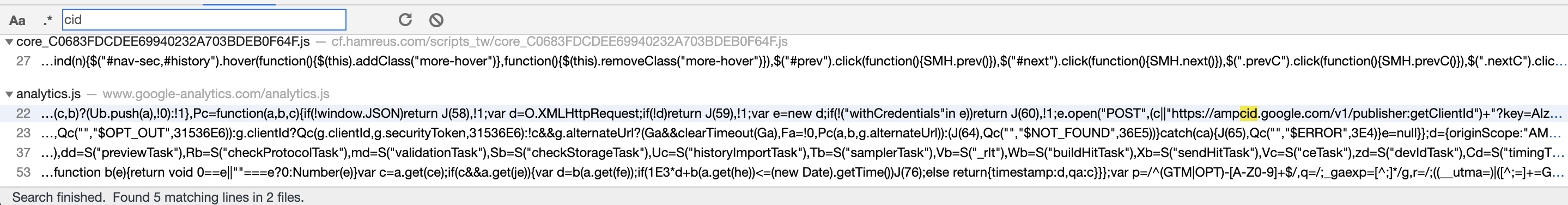 不过我们看到上面请求里还有另一参数cid,既然都是请求参数,那么md5这个参数可能是和他一起提交的,我们可以试试搜索cid关键词试试。