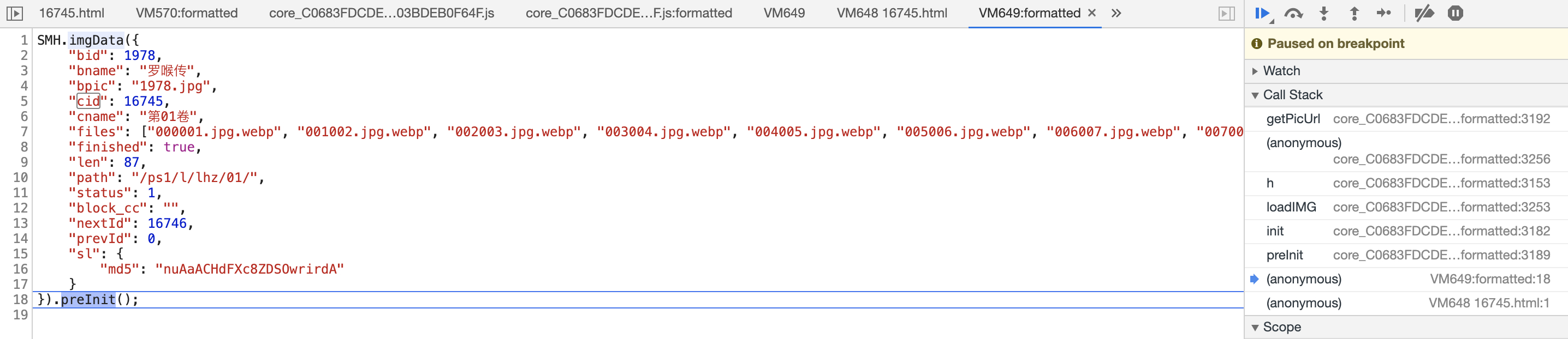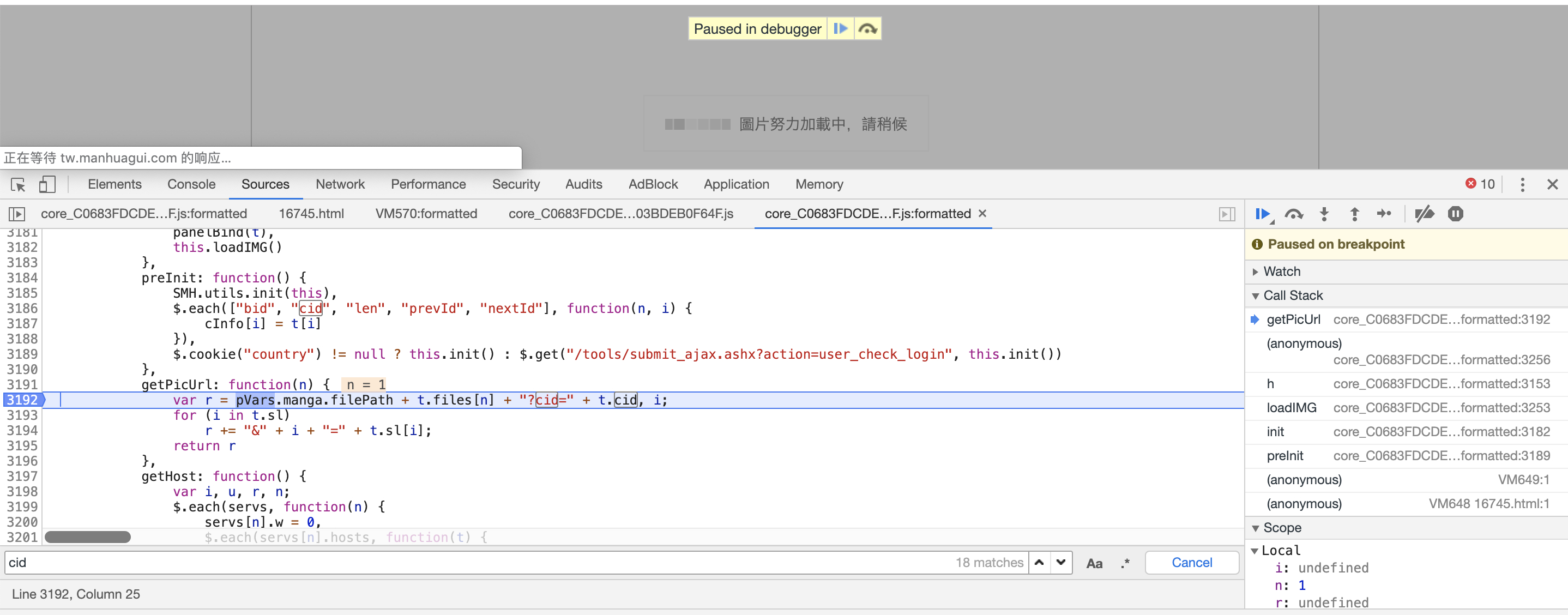 果然有点东西,我们点进第一个文件,搜索下有多少和cid这个参数相关搜索项,检索之后有18项相关,通过分析代码,很快我们定位到下图的代码,打上断点重新加载看看是否能进入我们的断点位置: