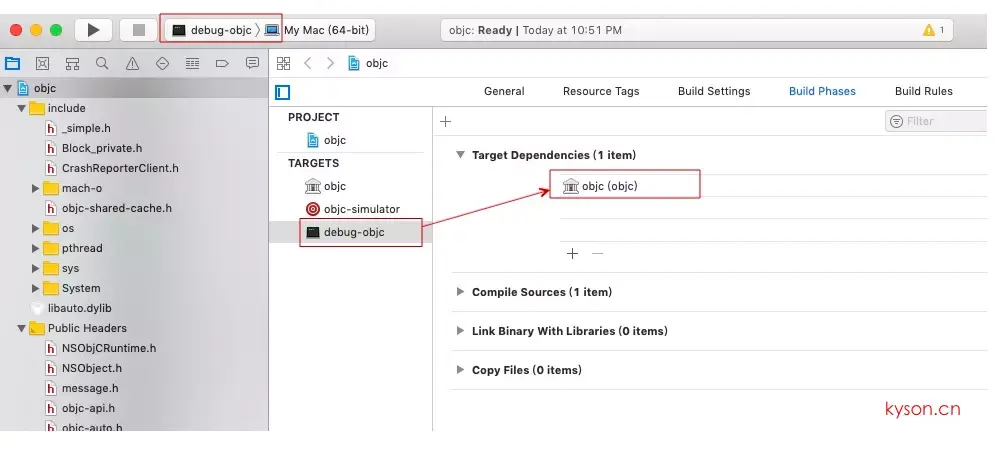 如图,打开工程后选择工程debug-objc,点击run即可。由于debug-objc依赖于objc(即runtime的源代码编译的库),因此我们在main函数中所有Objective-C的代码会调用我们编译的runtime,从而方便我们调试。