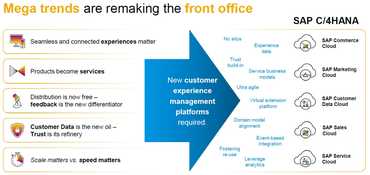 SAP C/4HANA的从业者都知道,这五朵云里包含的产品,有的是SAP自研产品,比如后台基于ABAP Netweaver的Marketing Cloud和Cloud for Customer,有的则是近些年来SAP收购的技术栈和架构各异的产品。