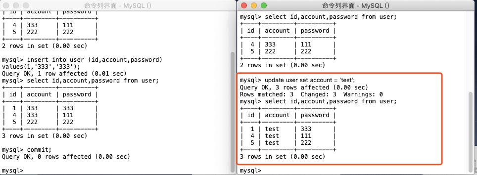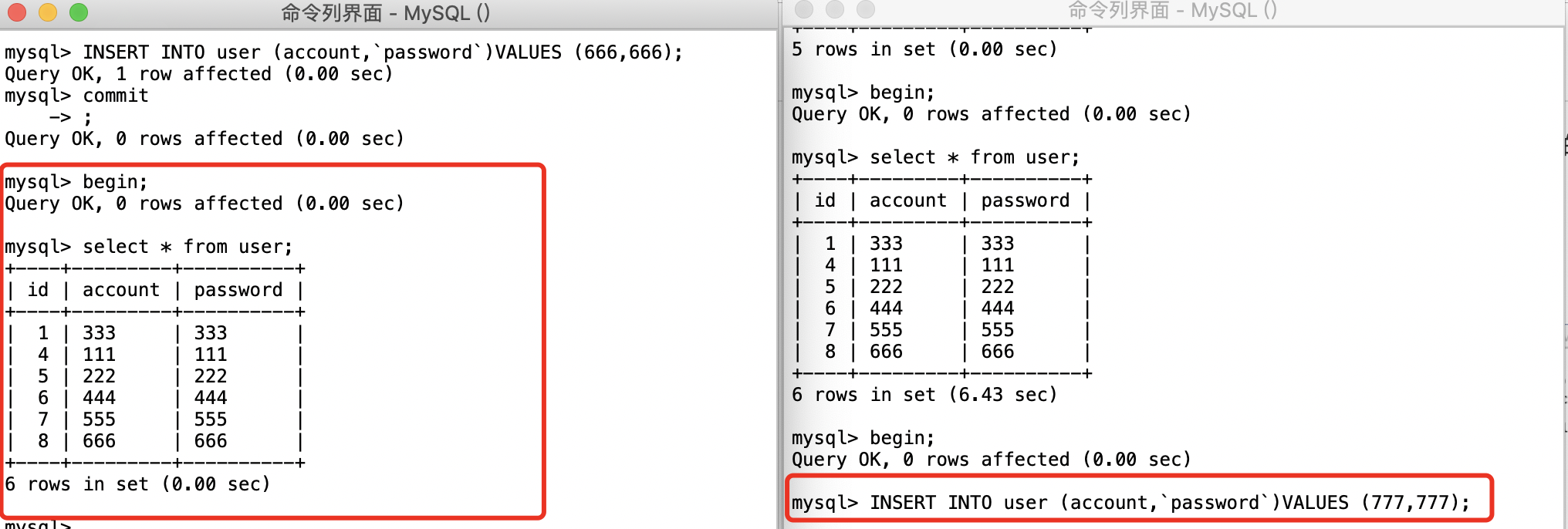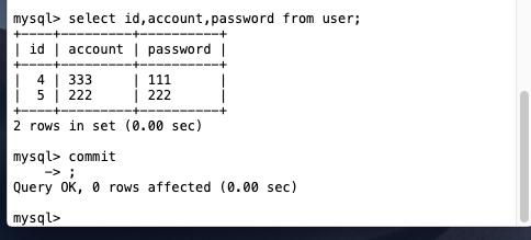 我们现在这里面插入两条数据,如图。下面我们打开两个命令行界面,来演示两个事务之间的相互影响。