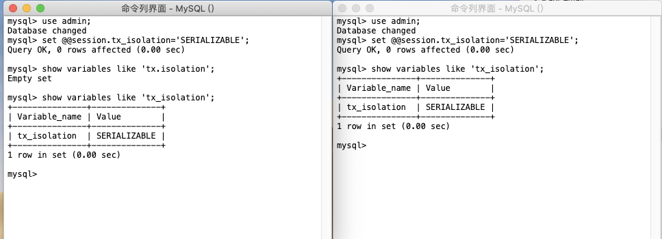 隔离级别:串行化 我们再开两个命令行界面,把隔离界别改成串行化,表还是用之前的那张表