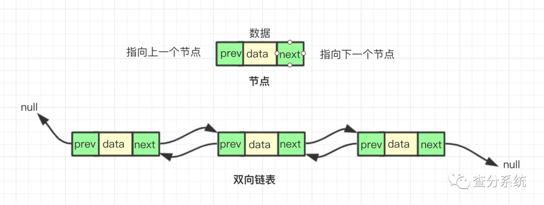 链表表头 prev 的指针为空,链表表尾 next 的指针为空