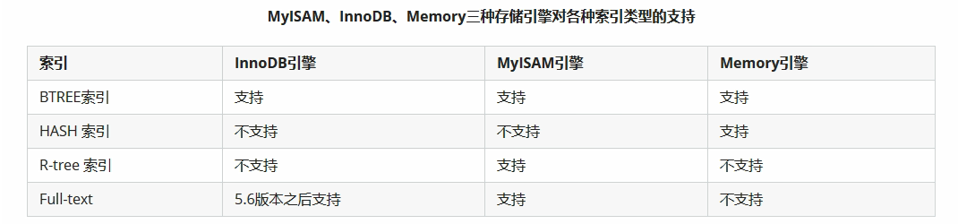 4)Full-text(全文索引):全文索引也是MyISAM的一个特殊索引类型,主要用于全文索引,InnoDB从MySQL5.6版本开始支持全文索引。