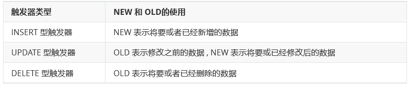 使用别名 OLD 和 NEW 来引用触发器中发生变化的记录内容,这与其他的数据库是相似的。现在触发器还只支持 行级触发,不支持语句级触发。