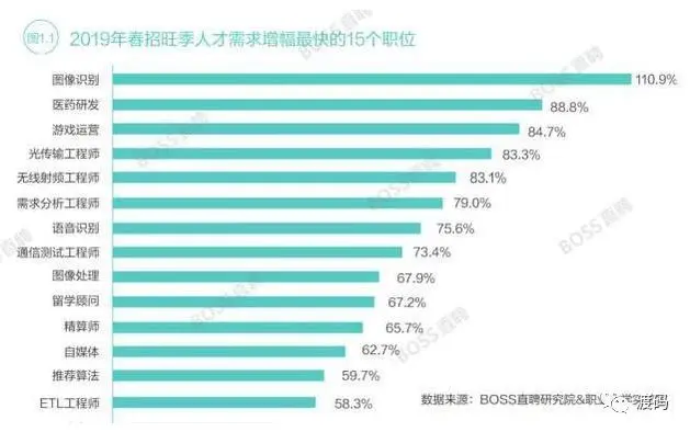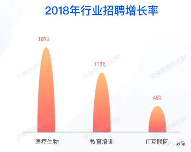 从 18 年行业招聘增长率来看,医疗和教育行业增长率最大,AI 和 5G 的应用在一定程度上会促进这两个行业的发展,所以未来医疗和教育行业有很大的前景。