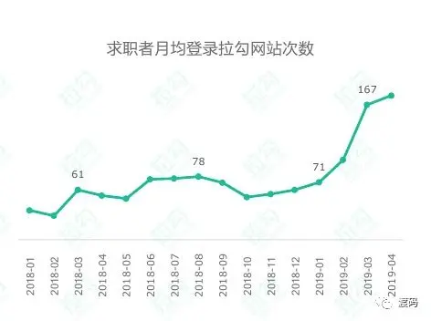 19年初求职者月均登录拉勾网次数翻倍,求职者更加活跃,大概率与裁员潮有关联。