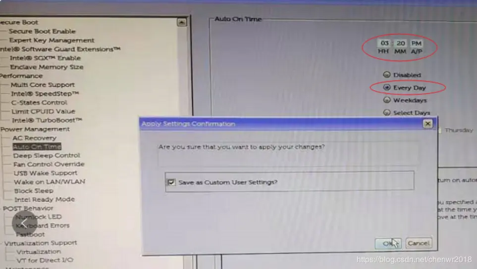 - 选择auto on time 设置好启动时间 (注意有的时候date/time时区不一致,需要去设置与北京时间一致,这时候设置auto on time 就是你希望每天自动开机的时间)