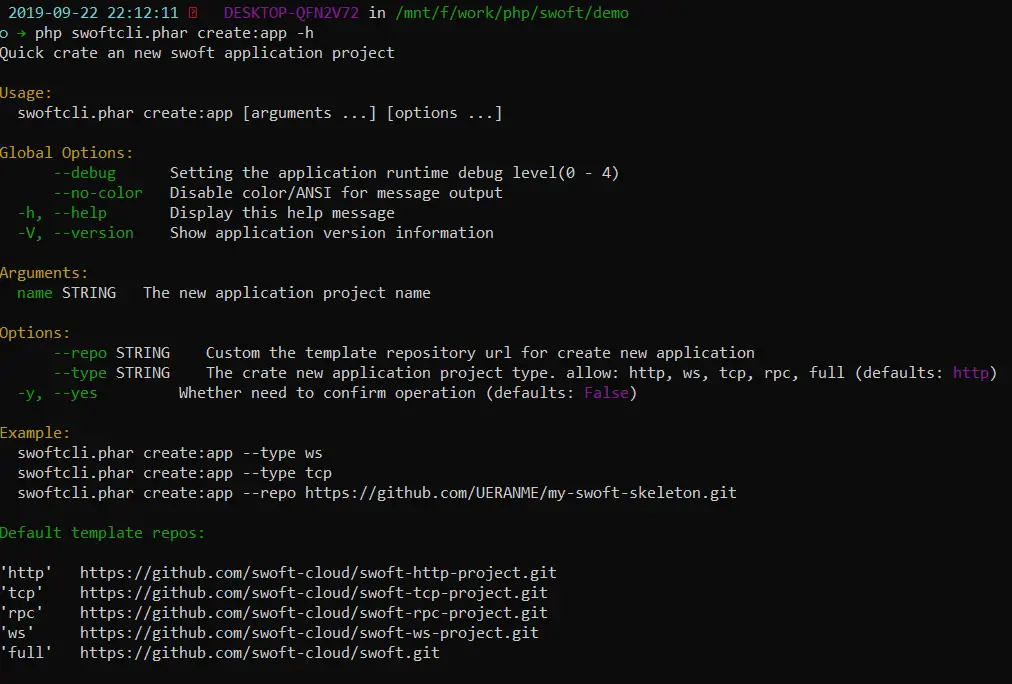 php swoftcli.phar create:application --help