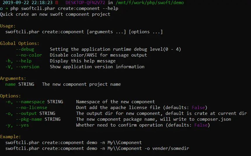 php swoftcli.phar create:component --help
