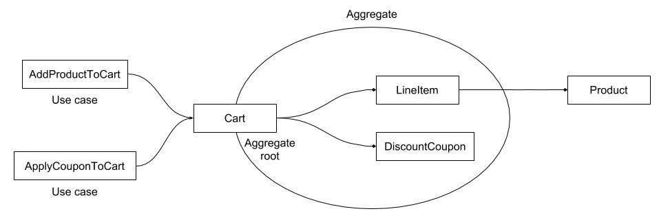 想一下购物车。购物车可以由购物车实体表示,该实体将由订单项组成,而订单项又是实体,因为它们具有自己的 ID。订单项只能通过主要实体购物车对象进行交互。想知道特定产品是否在购物车内?调用 cart.hasProduct(product) 方法,而不是像 cart.lineItems.find(...) 那样直接访问 lineItems 属性。对象之间的这种关系称为聚合,给定聚合的主要实体(在本例中为 cart 对象)称为聚合根。代表聚合及其所有组件概念的实体只能通过购物车进行访问,但聚合内部的实体从外部引用对象是可以的。我们甚至可以说,在单个实体能够代表整个概念的情况下,该实体也是由单个实体及其值对象(如果有)组成的聚合。因此,当我们说“聚合”时,从现在开始,你必须将其解释为适当的聚合和单一实体聚合。