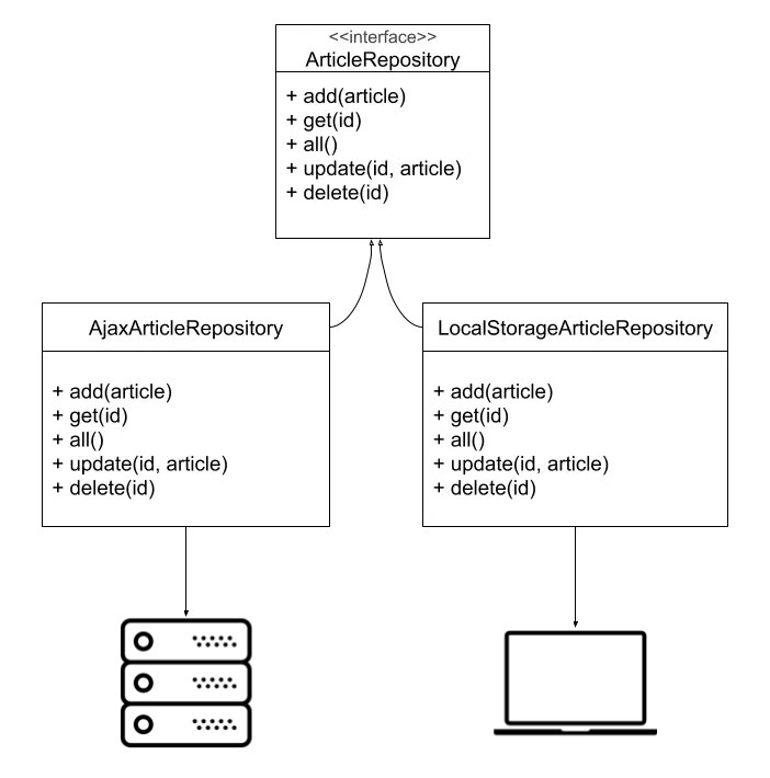 很高兴注意到,例如,如果 API 仍在开发中,我们可以通过实现一个名为 LocalStorageArticleRepository 的 ArticleRepository 来模拟它,该 ArticleRepository 与 LocalStorage 而不是与 API 交互。当 API 准备就绪时,我们然后创建另一个称为 AjaxArticleRepository 的实现,从而替换 LocalStorage 实现--只要它们都共享相同的接口,并注入通用名称即可,而不需要展示底层技术,例如 articleRepository。