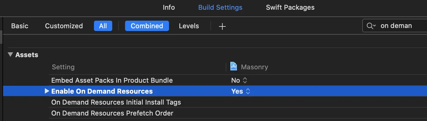 通过设置Xcode中的Build Settings设置,可以开启按需加载。