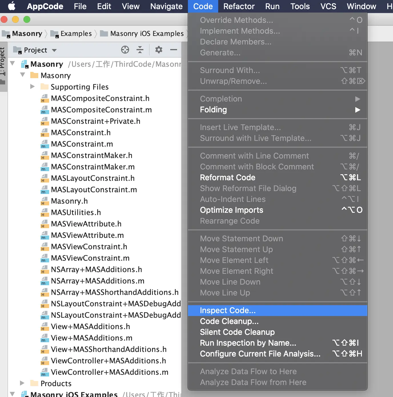 通过AppCode可以检查未使用的文件,拼写问题,类型检查等多种潜在疑难杂症。 通过Code->Inspect Code进行静态分析: