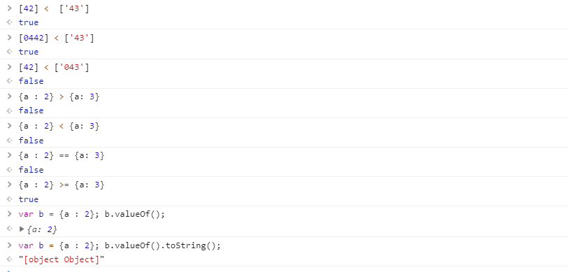 - 抽象关系比较 a < b a >= b !(a < b) 先调用toPrimitive 出现非字符串,则toNumber()强制类型转换,否则都为字符串根据ASCII码进行比较