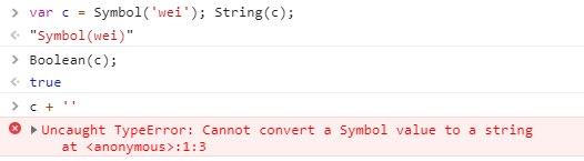 - 符号类型的转换:转化成数字将会出错,+隐式转化成字符串会出错,可以显示强制化成字符串,转化成boolean类型为true