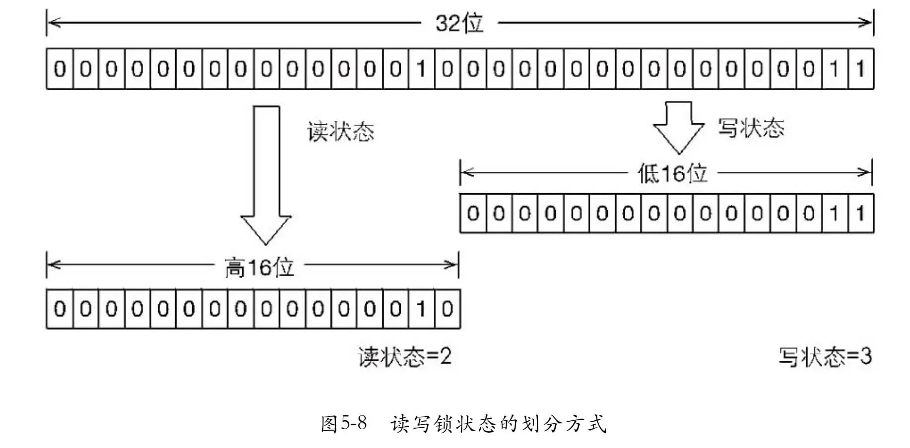 在 ReentrantLock 中,使用 Sync ( 实际是 AQS )的 int 类型的 state 来表示同步状态,表示锁被一个线程重复获取的次数。但是,读写锁 ReentrantReadWriteLock 内部维护着一对读写锁,如果要用一个变量维护多种状态,需要采用“按位切割使用”的方式来维护这个变量,将其切分为两部分:高16为表示读,低16为表示写。