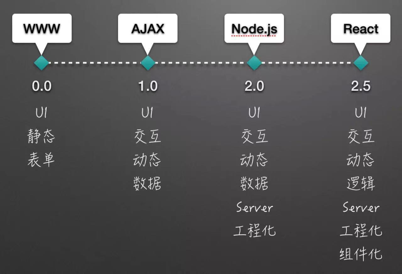 有一些声音认为 React 能够配得上"革命性"一词,因为它一定程度上改变了前端的编程模型,React 之前的前端是围绕 DOM,React 之后是面向数据。诚然如此,但跟 AJAX 和Node.js 相比,React 引起的变革仍显轻微。而 React 对前端组件化生态的影响也是在原有基础上的增强也并不能称为革命性。所以称 React 为前端 3.0 缺乏足够的说服力,不过前端 2.5 还是充分的。说到底,React 只是改变了前端领域自身,而 AJAX 和 Node.js 无一不是对前后端都有显著影响的技术。