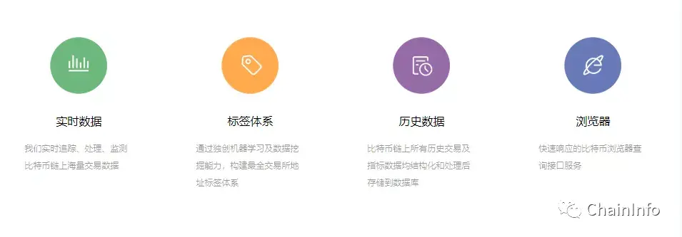 我们目前的API,主要是以下四大功能。包括实时更新数据,全网领先的标签体系,全量历史数据及快速响应的比特币浏览器。