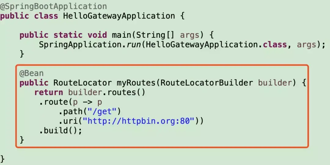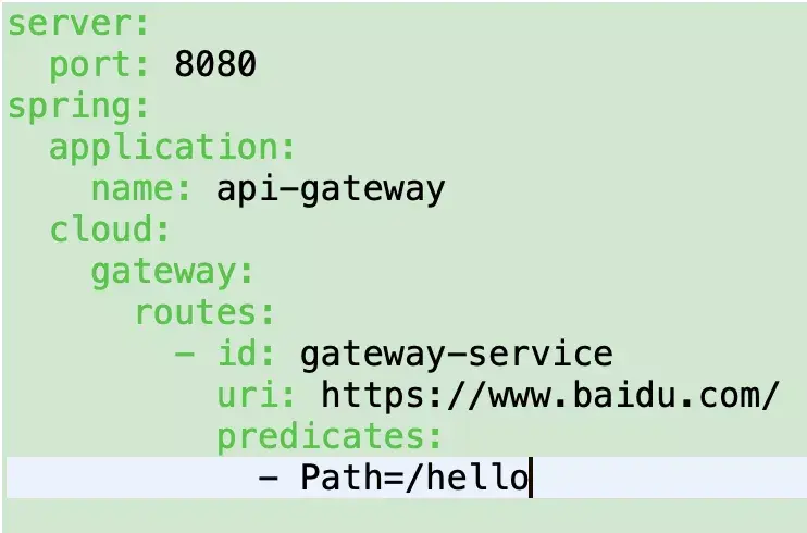 上面这段配置的意思是,配置了一个id为route-name的路由规则,当访问地址 http://localhost:8080/get 时会自动转发到地址:httpbin.org:80/get