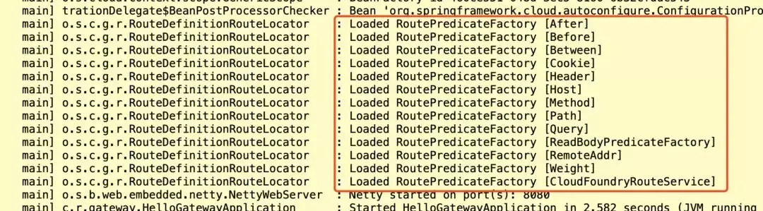 在项目启动日志中,我们就能发现有很多PredicateFactory。Gateway 是通过Spring WebFlux的HandlerMapping做为底层支持来匹配到转发路由,这些 Predicates 工厂通过不同的HTTP请求参数来匹配,多个 Predicates 工厂可以组合使用。