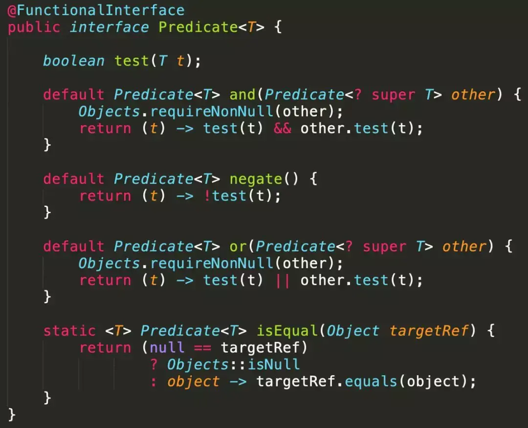 Predicate 来源于 Java 8,Predicate 接受一个输入参数,返回一个布尔值结果。该接口包含多种默认方法来将 Predicate 组合成其他复杂的逻辑(比如:与,或,非)。