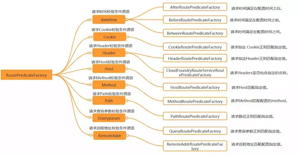 在 Spring Cloud Gateway 中 Spring 利用 Predicate 的特性实现了各种路由匹配规则,有通过 Header、请求参数等不同的条件来进行作为条件匹配到对应的路由。 网上有一张图总结了 Spring Cloud 内置的几种 Predicate 的实现。