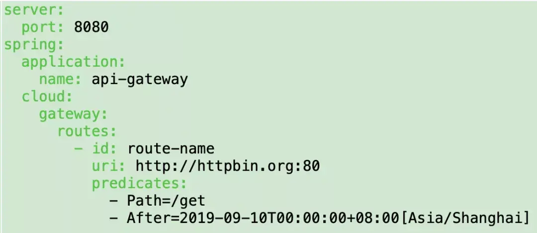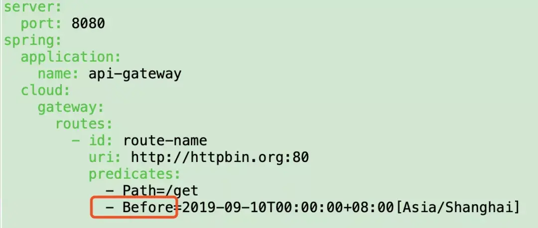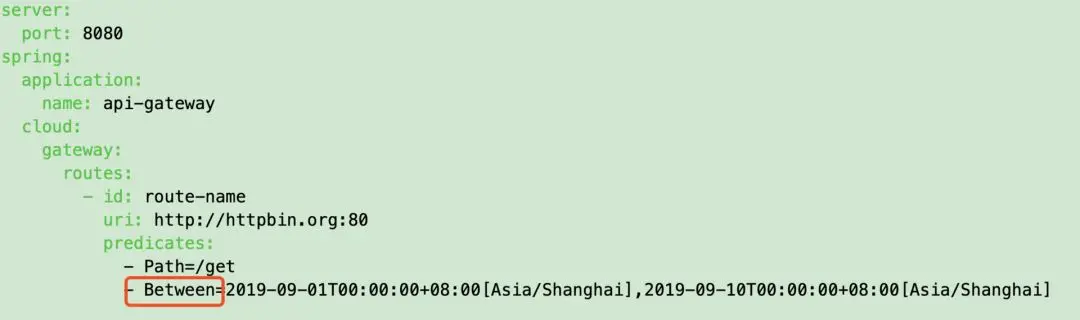 Gateway支持设置一个时间,在请求进行转发的时候,可以通过判断在这个时间之前或者之后进行转发。比如我们现在设置只有在2019年9月10日才会路由转发,在这之前不进行转发,我就可以这样配置: