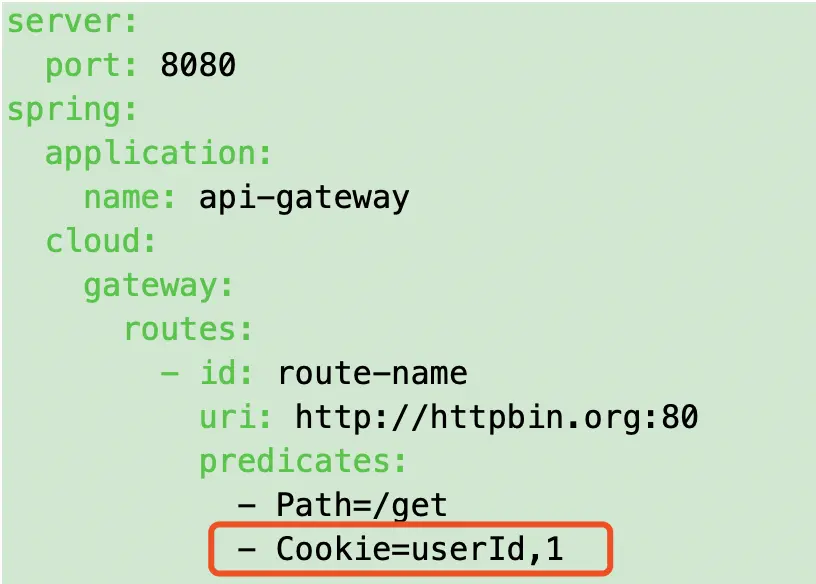 Cookie Route Predicate 可以接收两个参数,一个是 Cookie name ,一个是正则表达式,路由规则会通过获取对应的 Cookie name 值和正则表达式去匹配,如果匹配上就会执行路由,如果没有匹配上则不执行。