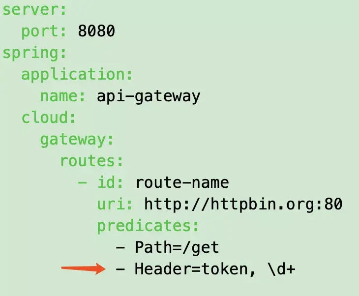 Header Predicate 和 Cookie Predicate 一样,也是接收 2 个参数,一个 header 中属性名称和一个正则表达式,这个属性值和正则表达式匹配则执行。