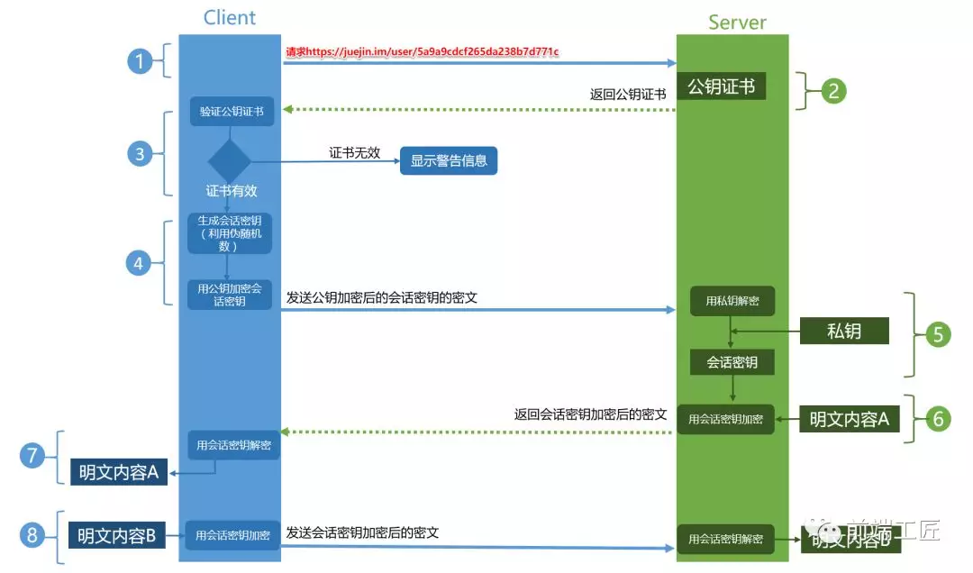 - Server使用对称密钥加密“明文内容A”,发送给Client。