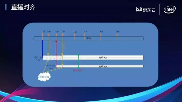 对于直播场景可以借鉴点播的逻辑,但由于不同用户的拉流时间点不同,因此只能在场景切换后的多档直播流做到对齐,不过针对某些场景切换特别长的情况,相应对齐部分也被拉长,直接影响了用户观看体验。京东云在直播对齐中引入了一些同步机制,在拉流过程中将同步信息加入到流中,这一操作并不会对转码效果产生影响,但收到同步信息的每条转码流可以在一个时间点插入I帧对齐,在体验和功能满足性上得到提升。
