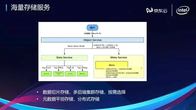 针对上面提到的挑战,京东云是如何做到百P级别存储服务的?对于一个经典模型——一个中央节点组成大目录树,下面是很多数据节点存储数据,类似于HDFS,实际上这个架构就可以满足视频存储的基本需求——视频上传、下载,但是在所承载的文件数量和容量上仍是无法满足,同时这种树形结构在磁盘访问、扩展性和中央节点管理磁盘能力上的表现并不好。因此,京东云构建了一套基于KV结构的视频存储系统,对NameNode从功能上做简化,将目录拉平——每一个文件名对应文件数据位置,用Meta Service管理文件名到文件数据位置的映射,由此可以看作为一个有效数组存储在多个集群中,元数据通过Meta调取不同集群中的数据,这种结构也更易于扩展。而在Data Service中,每个集群中的每个数据都对应唯一的ID(这个ID存储在元数据中),相当于一个flv文件映射为不同集群中对应ID的数据。这种多后端集群存储还具有一个优势——针对不同类型的数据可以在不同后端进行存储,比如类似m3u8这种需要频繁访问的文件可以放在SSD集群,ts文件可以放在标准存储集群,视频的冷备份可以放在EC集群,转码的中间文件可以放到RRS集群。