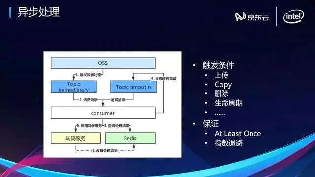对于一个视频,存储是基础,处理是目的,在京东云的数据处理框架中分为同步处理和异步处理。同步处理——在数据下载时同步做处理,相当于用计算资源换存储资源,它适用于一些图片水印、剪裁等场景,京东云同步处理框架提供了根据请求参数调度后端服务,以及同时支持传数据和传链接两种方式的数据处理服务能力。对于异步处理——基于存在数据离线做处理,整个异步处理框架我们是通过多个消息队列实现的——即时处理和不同时间的延时处理消息队列,由此我们可以保证至少一次的鉴黄调用以及后端服务繁忙时指数退避。