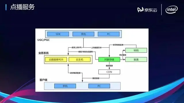 对于点播或者直播服务,高吞吐、低延时的性能、高可用性以及成本优化成为了关键。京东云基于公有云的点播服务中,用户从云主机(业务系统)请求上传链接,这个上传链接对应存储链接,用户直接通过客户端上传数据到对象存储服务,再通过异步处理机制触发业务逻辑(如转码、鉴黄),处理完成后上传到对象存储服务通过异步处理机制触发自有业务系统(如媒资管理等),最后生成链接通过CDN分发。