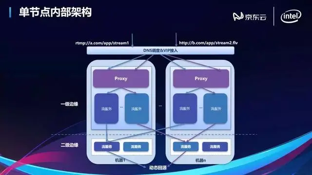 对于一个直播云架构而言,核心诉求集中在高可用、易扩展、高性能三方面,在这一背景下,我们首先需要挖掘单机或单节点的性能潜力。京东云会将每个节点抽象为虚拟的两层,在节点内部的边缘上通过轮询的方式将流量打散接入,如果出现突发流量可以充分利用每个机器的能力,在流量打散后内部通过哈希汇聚到内部逻辑的二级源,再由二级源做真正的回源。当有多路流时可以合并回源,减小回源带宽,同时有效减少它们内部的交互成本。