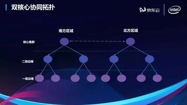 在充分挖掘单机及单节点潜力的基础上,我们进行CDN组网。在最初的单核心拓扑架构实践中,我们发现存在两个问题:首先是无法动态选路,其次核心集群只有华北地区一个,存在明显的单点问题。因此在这个基础上我们设立了南方核心集群形成双核心协同架构,南北方核心集群通过专线连接,由此也同时实现了异地灾备,提升了整体可用性。但这套架构存在同样的问题,也就是线路选择仍旧依靠运维经验手工配置,响应速度无法很好满足。
