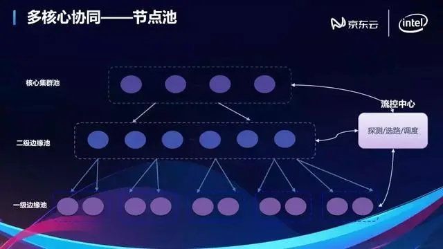 伴随京东云核心集群和边缘节点的不断建设扩充,京东云通过流控中心实时探测网络情况,对回源线路进行统一调度,实现二级源之间回源、二级源和其他核心集群回源等多种动态调度备线方案。当其中一个节点出现网络抖动或故障时,其他节点可以即时从备选线路回源。至此,各层级集群发展为“节点池”的概念,也就是不再依赖人工运维状态下的以地域划分集群,而是形成核心集群池、二级边缘池和一级边缘池,分发回源和推流回源通过流控中心实时探测生成最优线路及多条备线。特别一提的是,普通CDN是通过IDC到IDC进行网络质量探测,而京东云基于京东商城配送站资源,将其模拟为一个端探测CDN边缘节点质量,提升边缘节点到用户的最后一公里质量。