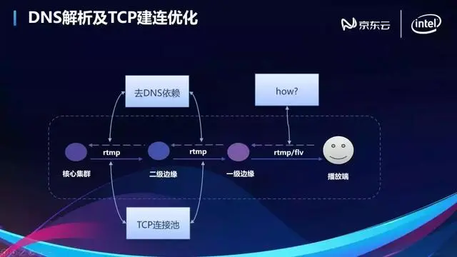 我们知道直播云质量评价核心指标包括首开时间、卡顿率、内容延迟和可用性,上面所讲架构演进更多是围绕可用性提升展开,京东云在首开时间和卡顿率方面也做了很多优化工作。首开时间的消耗主要在DNS解析、TCP建连、应用层握手及协商、数据发送等几方面。要加速首开,最简单可以想到的就是通过主动预热把流提前拉到边缘节点:视频数据距离用户越近首开时间一定就快。但对于直播长尾效应而言,预热这种手段对CDN来说无疑具有非常巨大的成本压力,常态服务时无法使用。长尾效应下存在大量的直播冷起播放,针对冷起情况下的首开优化就尤为重要。在内部交互(一级边缘到核心集群)中我们通过“去DNS依赖”和维护“长连接的TCP连接池”的方式消除DNS解析和TCP建连的时间消耗,而一级边缘到用户端可以通过在Client端进行“DNS预解析”节省DNS解析时间(这部分需要Client进行优化)。于此同时,针对应用层握手及协商过程,京东云放弃了原生的RTMP协议(需要5-7个RTT),内部使用私有KTMP协议(playload兼容RTMP),在1个RTT完成握手及协商,这样极大的降低了握手及协商过程的交互开销。
