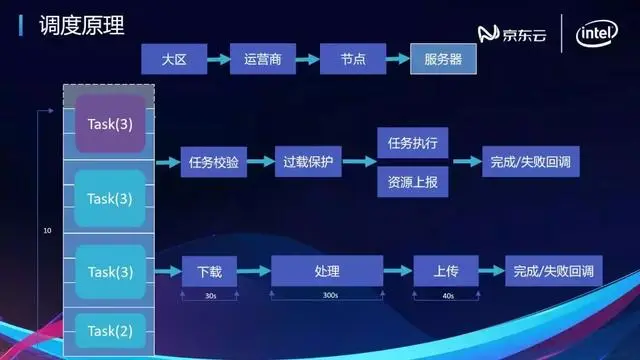 在调度中,不同任务消耗的资源重心也会不同,比如转码对CPU消耗较多,而另一种业务对带宽消耗较多,因此我们抽象了一个load的概念,用它表示任务在机器上的综合指标,我们通过算法不断优化load值从而提升整体资源利用率。而在调度过程中可能出现由于信息延迟导致一个任务分配到一台机器之后发现资源不够的情况,这里我们引入了超频的概念,如果当前任务所需资源超出部分在这台机器可承受范围内(我们设定一个百分比的过载保护机制),则不需要再进行二次调度。