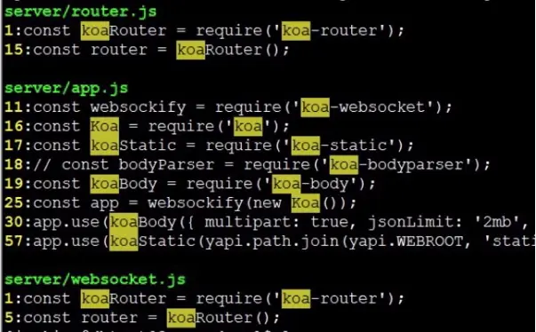 七、最后再推荐一个代码搜索命令ack,linux下可以直接yum安装:yum install ack 使用举例,以关键字“koa”搜索.js文件(--js),忽略大小写(-i),忽略static目录: ack --js "koa" -i --ignore-dir=static